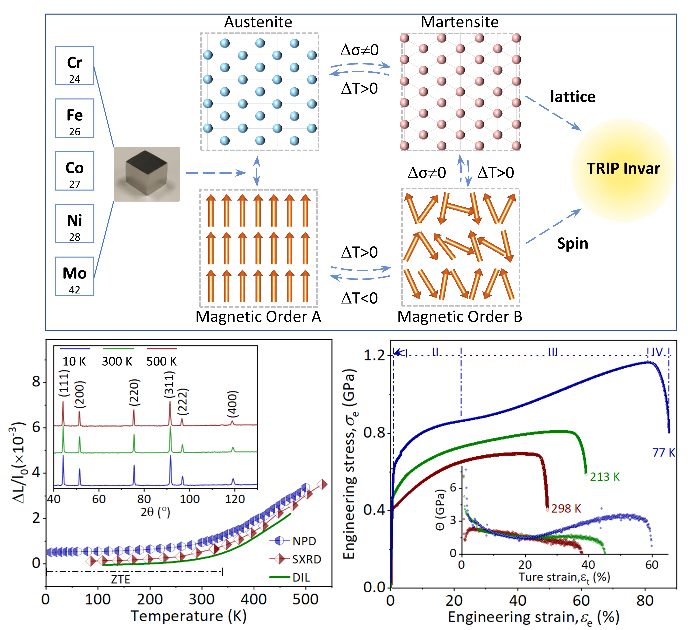 因瓦合金自1920年获诺贝尔奖以来,凭借零热膨胀特性在航空航天等领域广泛应用。百年发展中衍生出增强型Super-Invar和耐腐蚀Stainless-Invar,但低温韧性不足始终是瓶颈。近期稀土金属化合物等改进虽优化了零热膨胀性能,却加剧了脆性。据此,本工作提出“TRIP-Invar”概念:通过在自旋驱动的零热膨胀(Invar)材料中引入晶格自由度,实现双功能协同——温度场下,自旋态转变引发磁体积效应,抵消热振动产生零热膨胀;应力场下,晶格发生多相马氏体相变(fcc-hcp-bcc),通过相变耗散能量提升塑性与韧性。自旋-晶格耦合使变形后的磁性与热膨胀性能可通过热处理可逆恢复,兼具尺寸稳定性、低温力学性能及本征修复能力。
