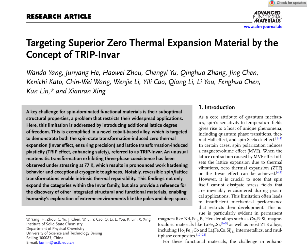 该成果题以“Targeting Superior Zero Thermal Expansion Material by the Concept of TRIP-Invar”为题,近期发表在《先进功能材料》(Advanced Functional Materials)。论文第一作者为北京科技大学固体化学研究所博士生杨万达,共同第一作者为中南大学何骏阳副研究员,通讯作者为固体化学研究所林鲲教授。该工作得到国家自然科学基金资助。论文链接:https://doi.org/10.1002/adfm.202522039。